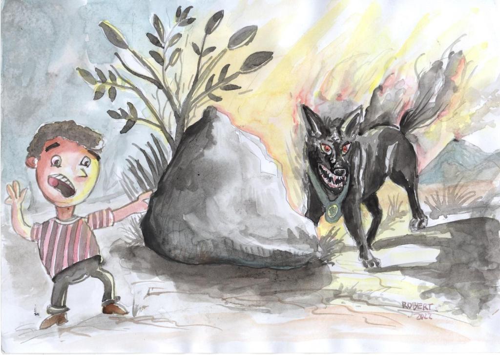 El muchacho al parecer ya estaba tranquilo y estable pero su mirada seguía perdida y sin aun ponerse en sí, más sin embargo lo llevaron a su cama, lo acurrucaron, el muchacho durmió y despertó muy por la mañana se levantó de la cama y rápidamente se acercó al fogón donde su padres preparaban el desayudo, y con la vos entrecortada les empezó a contar lo que había visto mientras cuidaba el agua; dijo papá y mamá, mientras estaba cuidando que agua llegase al terreno, al pasar por la piedra del Poglio miré una luz que brilla muy intensamente detrás de la piedra y de allí poco apoco aparecía una sombra como de un perro negro gigante con los colmillos grande que igualmente brillaba, el mismo que sonaba como campanas al momento que el animal movía; solo se dejó ver un momento, al verme hecho a correr, de ahí ya no me acuerdo más, talvez fue con rumbo a la montaña o regresó a ocultarse en la piedra la verdad no me acuerdo más, sino cuando hoy por la mañana me desperté en la cama dijo el muchacho a su padres mientras la madre al mismo tiempo que escuchaba la historia de su hijo servía el desayuno, el padre quedo pasmado ante la historia que contaba su hijo y la madre angustiada dijo ese perro negro es el malo es el malo, tenemos que llevar a nuestro hijo a comulgar.